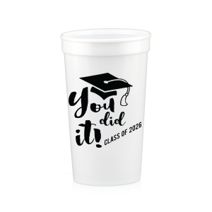 Zoom Show guides Loading product You Did It Cup 16-oz.Stadium Cup Design ID: 1375885 Click on swatch to see options Choose Your Product Color Active Color Cup Colors Cup Colors Clear Gold Black Silver White Yellow Lime Green Teal Navy Royal Blue Powder Blue Purple Maroon Hot Pink Light Pink Red Orange Choose Your Screen Print Active Color Metallic Cup Ink Metallic Cup Ink Silver Ink Gold Ink Copper Ink Matte Cup Ink Matte Cup Ink Matte Chocolate Ink Matte Black Ink Matte Slate Gray Ink Matte White Ink Matte Sunflower Ink Matte Moss Green Ink Matte Sage Ink Matte Leaf Ink Matte Spruce Matte Teal/Peacock Ink Matte Sky Blue Ink Matte French Blue Ink Matte Royal Blue Ink Matte Navy Ink Matte Cobalt Ink Matte Lavender Ink Matte Ballet Pink Ink Matte Fuchsia Ink Matte Lipstick Red Ink Matte Merlot Ink Matte Tangerine Ink Personalize further with different fonts, graphics, positioning, and sizes. (Optional) Customize More Choose Your Quantity Subtotal PRICE INCLUDES: Select a Proof Option: Print As Is I confirm that I have reviewed my design and I understand it will be produced as shown and no proof will be provided. Digital Proof + $15 I would like an expert FYP designer to look at my design, make minor corrections if necessary, and send me a black and white proof before the order is produced. Orders delivered as soon as 12.19.2025. Exclusions apply. Share Your Design About This Design ForYourParty's personalized Yellow 16 oz Stadium Cup with Matte Black Ink Cup Ink Colors has a Cap graphic and is good for use in Graduation themed parties and can be personalized to match your party's exact theme and tempo. Product Details Product Details Minimum order of 50 Measures 4.375" tall and 3.6" wide at the top Thin manufacturer mark may appear 0.75" to 1" from the bottom of the cup Ideal for beer BPA-free and recyclable Shatterproof and top-rack dishwasher safe Bulk discounts available Expedited shipping options available. Product Description Product Description Want a cup that’s reminiscent of fun parties, fall sports, and great times? Our stadium cups are made of sturdy colorful plastic and are perfect for birthdays, home entertaining, or casual get-togethers. Like our 22 oz. stadium cups, our 16 oz. stadium cups are made of reusable, dishwasher-safe plastic, and are available in colors to match any home or team. Use them for beer or soft drinks at your next tailgate! Product Options 16-oz.Stadium Cup 16-oz. Color Changing Cup 22-oz. Stadium Cup Related Products 16-oz.Stadium Cup 16-oz. Color Changing Cup 22-oz. Stadium Cup